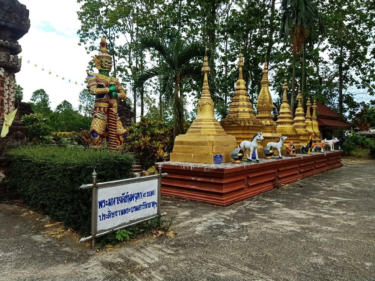 ตามตำนานโยนกกล่าวว่า ราวพรรษาที่ 19-20 หลังการตรัสรู้ สมเด็จพระสัมมาสัมพุทธเจ้าเสด็จมาโปรดสัตว์ ณ โยนกนาคนคร ทรงบิณฑบาตในเมืองแล้วเสด็จไปฉันเพลที่ถ้ำปุ่ม จากนั้นทรงดำเนินไปที่ถ้ำเปลวปล่องฟ้า นำห่อหมกปลาและปลาไม้หีบปิ้งที่ได้รับบิณฑบาตรมาอธิษฐานให้เขากลับมีชีวิตให้พระอานนท์เทน้ำจากบาตร และเทปลาลงรูเหวถ้ำเปลวปล่องฟ้า น้ำนั้นได้ไหลออกหน้าผาทางทิศตะวันออกเกิดเป็นถ้ำปลาและแม่น้ำ ถึงปัจจุบันนี้ พระองค์ทรงมอบพระเกสาเส้นหนึ่งบรรจุในก้อนหินใหญ่และปิดรูเหวที่ทรงเทน้ำนั้นไว้เพื่อเป็นที่สักการะ และตรัสว่าที่หินก้อนใหญ่ในถ้ำเคยมีอดีตพระพุทธเจ้าทุกพระองค์์เสด็จมาให้เกสาธาตุไว้ พระเจ้าอชุตตราชแห่งเมืองเชียงแสนได้รับสั่งให้สร้างสถูปเจดีย์ครอบหินที่บรรจุพระเกสาธาตุทั้งที่ถ้ำปุ่มและถ้ำเปลวปล่องฟ้า สถูปเจดีย์นี้จึงมีชื่อว่าพระธาตุเจดีย์เปลวปล่องฟ้า