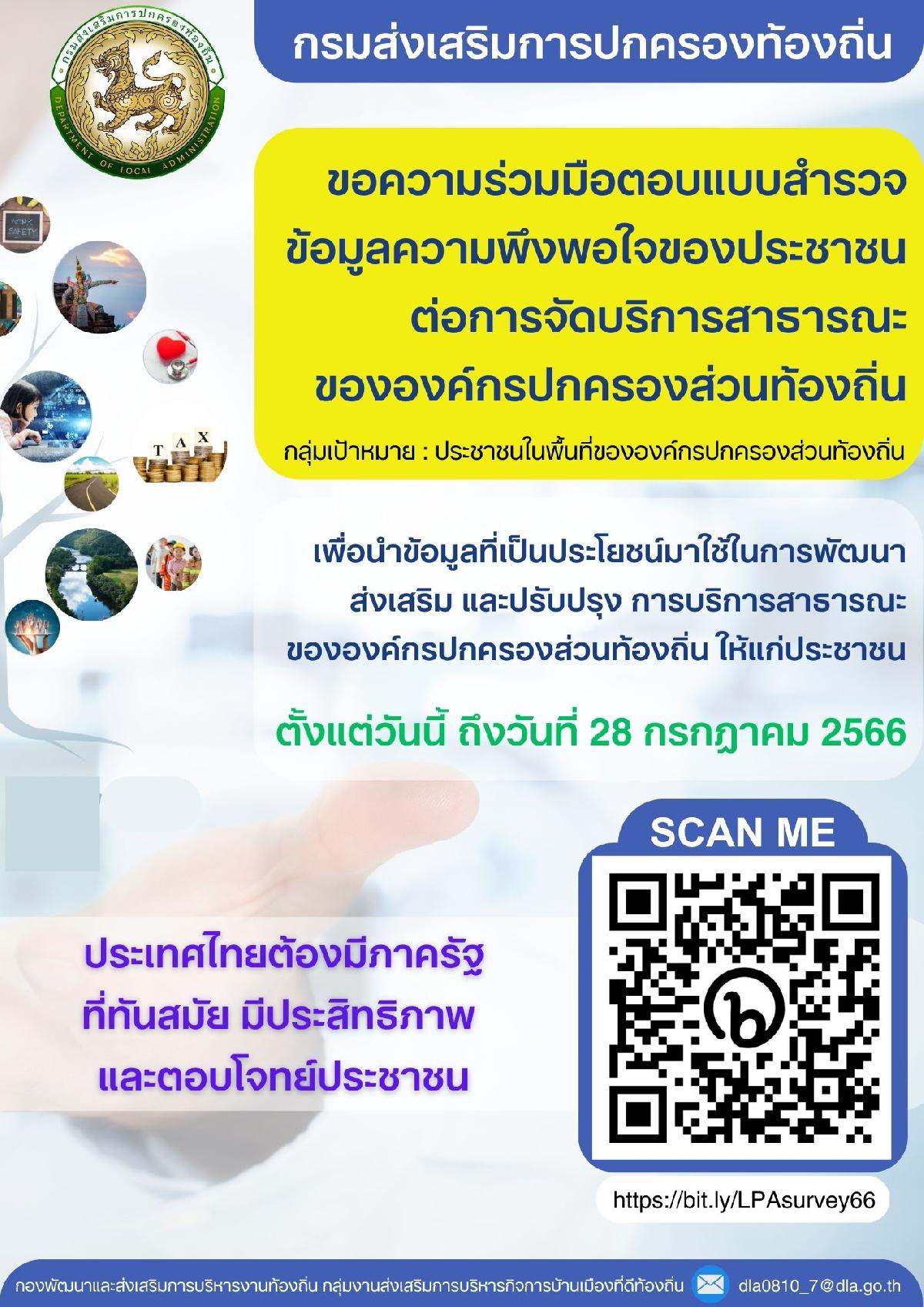 กรมส่งเสริมการปกครองท้องถิ่นขอความร่วมมือประชาชนตอบแบบสำรวจข้อมูลความพึงพอใจของประชาชนต่อการจัดบริการสาธารณะขององค์กรปกครองส่วนท้องถิ่น ตั้งแต่วันนี้ถึงวันที่ 28 กรกฎาคม 2566 เพื่อนำข้อมูลที่เป็นประโยชน์มาใช้ในการพัฒนา ส่งเสริม และปรับปรุง การบริการสาธารณะขององค์กรปกครองส่วนท้องถิ่นให้แก่ประชาชน
