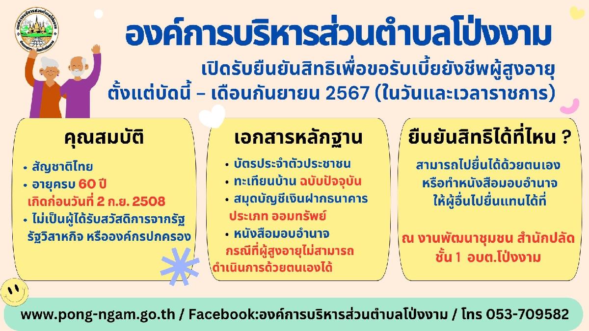 องค์การบริหารส่วนตำบลโป่งงาม เปิดรับยืนยันสิทธิการขอรับเงินเบี้ยยังชีพผู้สูงอายุ ได้ ตั้งแต่บัดนี้ – เดือนกันยายน 2567