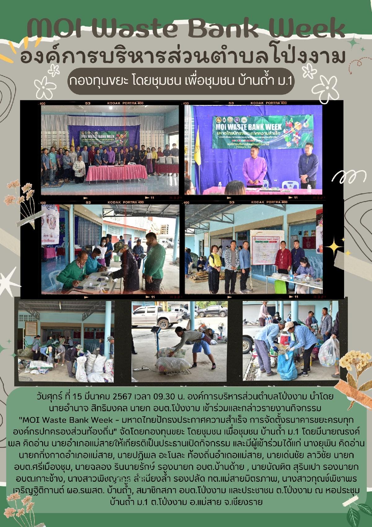องค์การบริหารส่วนตำบลโป่งงาม นำโดย นายอำนาจ สิทธิมงคล นายก อบต.โป่งงาม เข้าร่วมและกล่าวรายงานกิจกรรม "MOI Waste Bank Week - มหาดไทยปักธงประกาศความสำเร็จ การจัดตั้งธนาคารขยะครบทุกองค์กรปกครองส่วนท้องถิ่น" จัดโดยกองทุนขยะ โดยชุมชน เพื่อชุมชน บ้านถ้ำ ม.1 โดยมีนายณรงค์พล คิดอ่าน นายอำเภอแม่สายให้เกียรติเป็นประธานเปิดกิจกรรม และมีผู้เข้าร่วมได้แก่ นางยุพิน คิดอ่าน นายกกิ่งกาดอำเภอแม่สาย, นายปฏิพล อะโนละ ท้องถิ่นอำเถอแม่สาย,