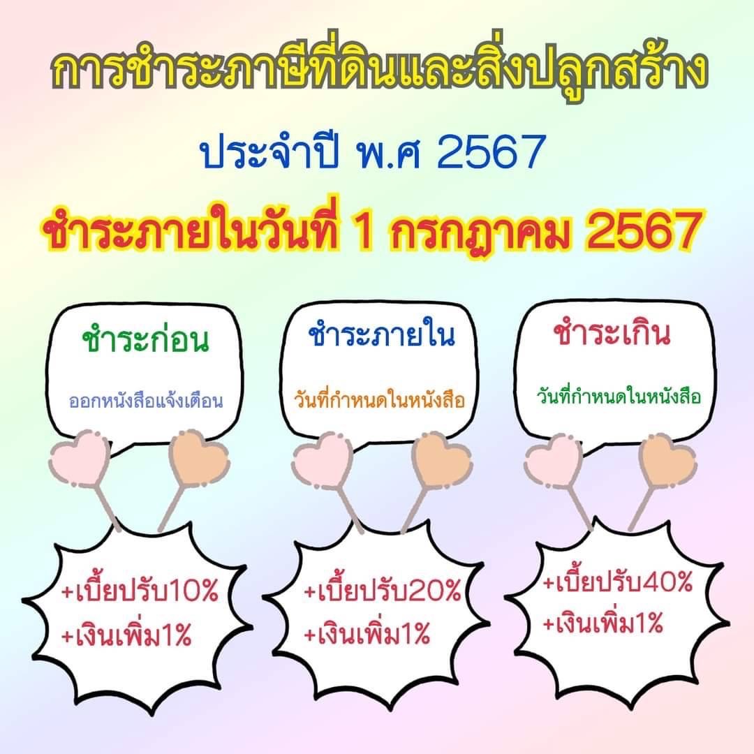 ประชาสัมพันธ์ การชำระภาษีที่ดินและสิ่งปลูกสร้าง ประจำปี 2567 ชำระภายในวันที่ 1 กรกฎาคม 2567 นี้