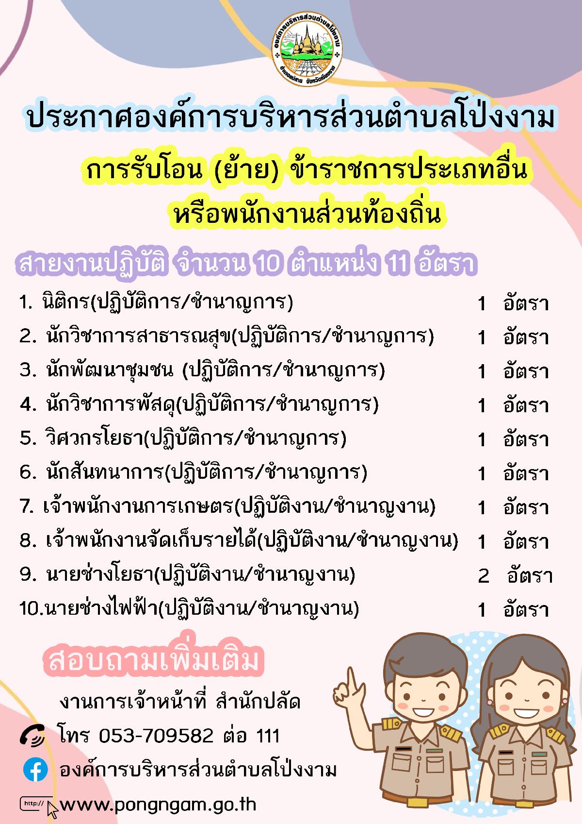ทางอบต.โป่งงาม มีความประสงค์จะรับโอน (ย้าย) พนักงานส่วนตำบล ข้าราชการหรือพนักงานส่วนท้องถิ่น เพื่อมาดำรงตำแหน่งสายงานผู้ปฏิบัติที่ว่าง จำนวน 10 ตำแหน่ง 11 อัตรา