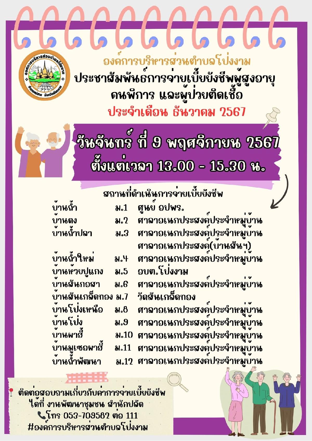 กำหนดการจ่ายเงินเบี้ยยังชีพผู้สูงอายุ ผู้พิการ และผู้ติดเชื้อ ประจำเดือน ธันวาคม 2567