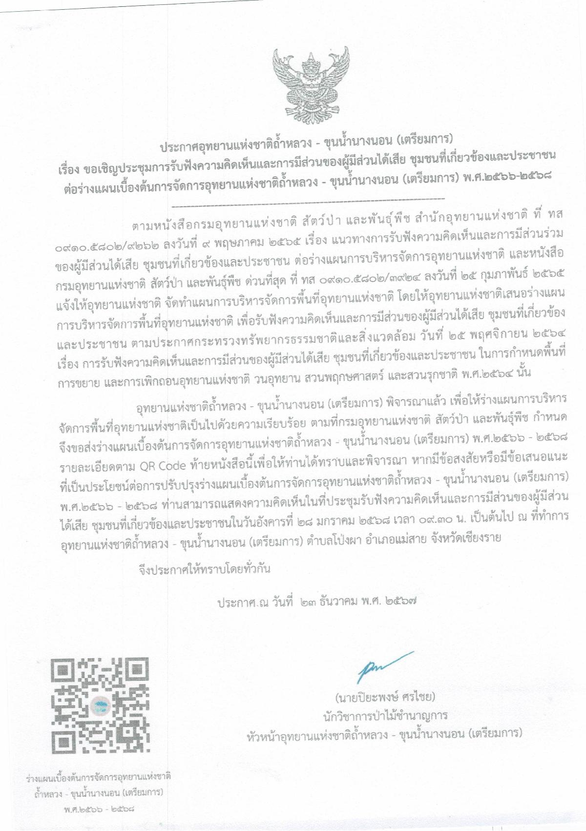 เรื่อง ขอเชิญประชุมรับฟังความคิดเห็นและการมีส่วนร่วมของผู้ส่วนได้เสีย ชุมชนที่เกี่ยวข้องและประชาชนต่อร่างแผนเบื้องต้นการจัดการอุทยานแห่งชาติถ้ำหลวง - ขุนน้ำนางนอน(เตรียมการ) พ.ศ.2566-2568