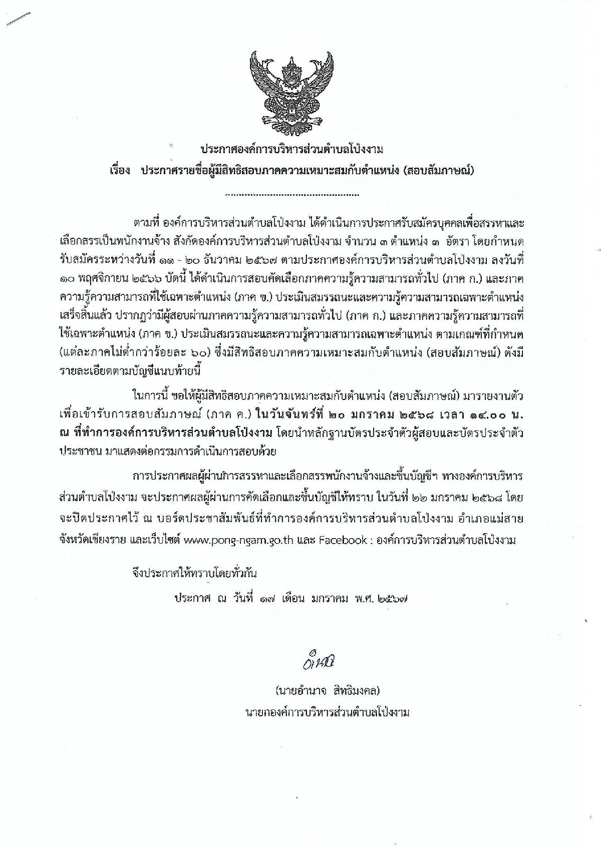 ประกาศองค์การบริหารส่วนตำบลโป่งงามเรื่อง ประกาศรายชื่อผู้มีสิทธิสอบภาคความเหมาะสมกับตำแหน่ง(สอบสัมภาษณ์)