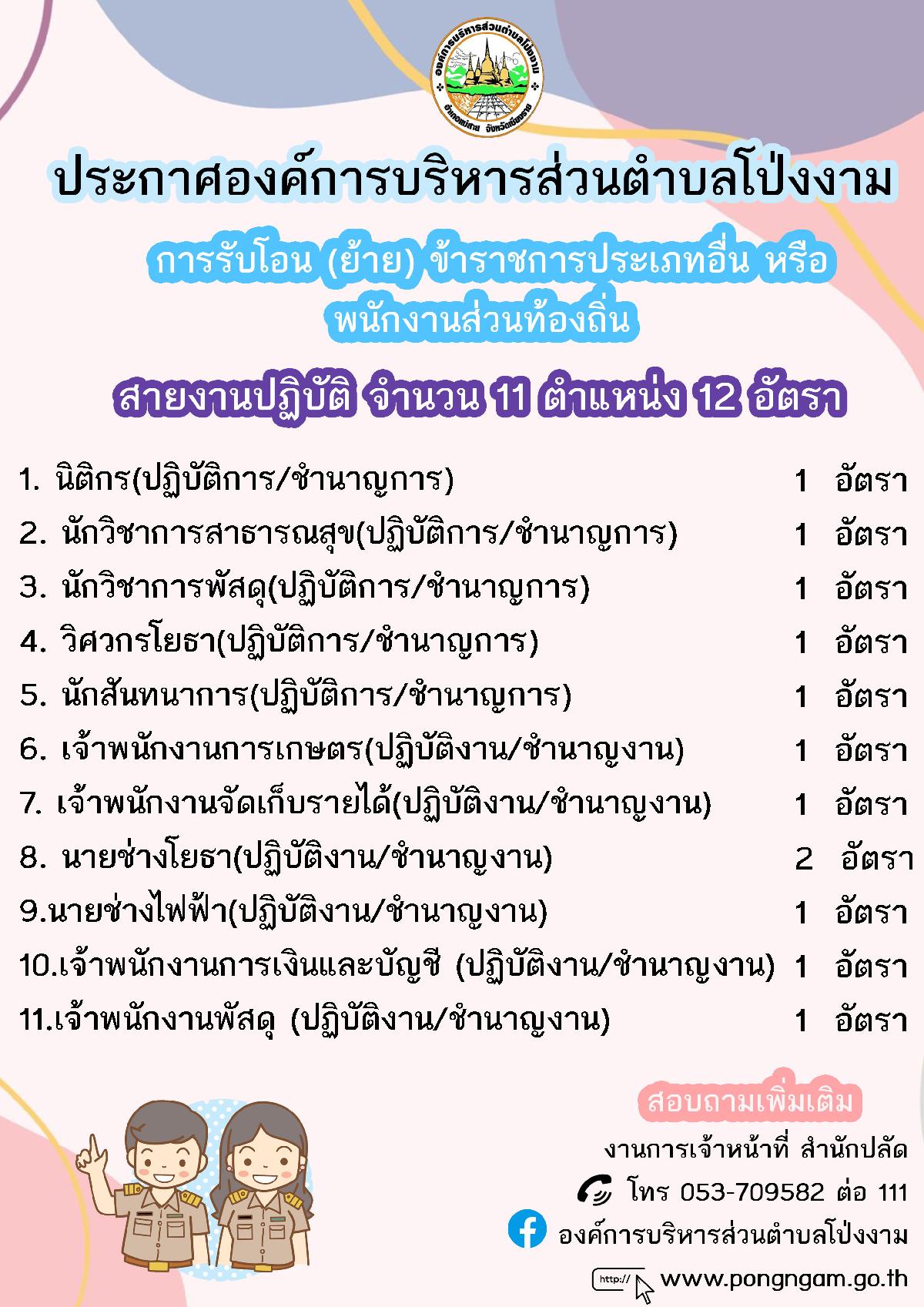 ทางอบต.โป่งงาม มีความประสงค์จะรับโอน (ย้าย) พนักงานส่วนตำบล ข้าราชการหรือพนักงานส่วนท้องถิ่น เพื่อมาดำรงตำแหน่งสายงานผู้ปฏิบัติที่ว่าง จำนวน 11 ตำแหน่ง 12 อัตรา