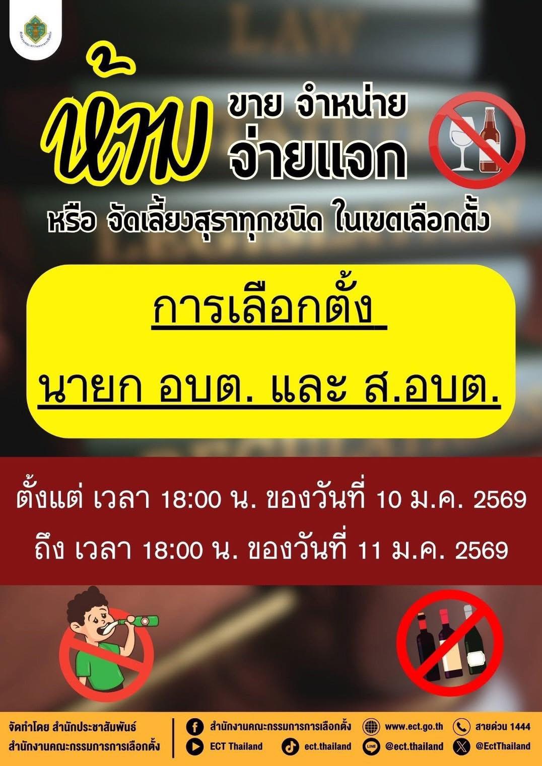 ‼️ห้ามขาย จำหน่าย จ่ายแจก หรือจัดเลี้ยงสุราทุกชนิด ในการเลือกตั้ง อบต. ตั้งแต่เวลา 18.00 น. ของวันเสาร์ที่ 10 มกราคม 2569 จนถึงเวลา 18.00 น. ของวันอาทิตย์ที่ 11 มกราคม 2569‼️