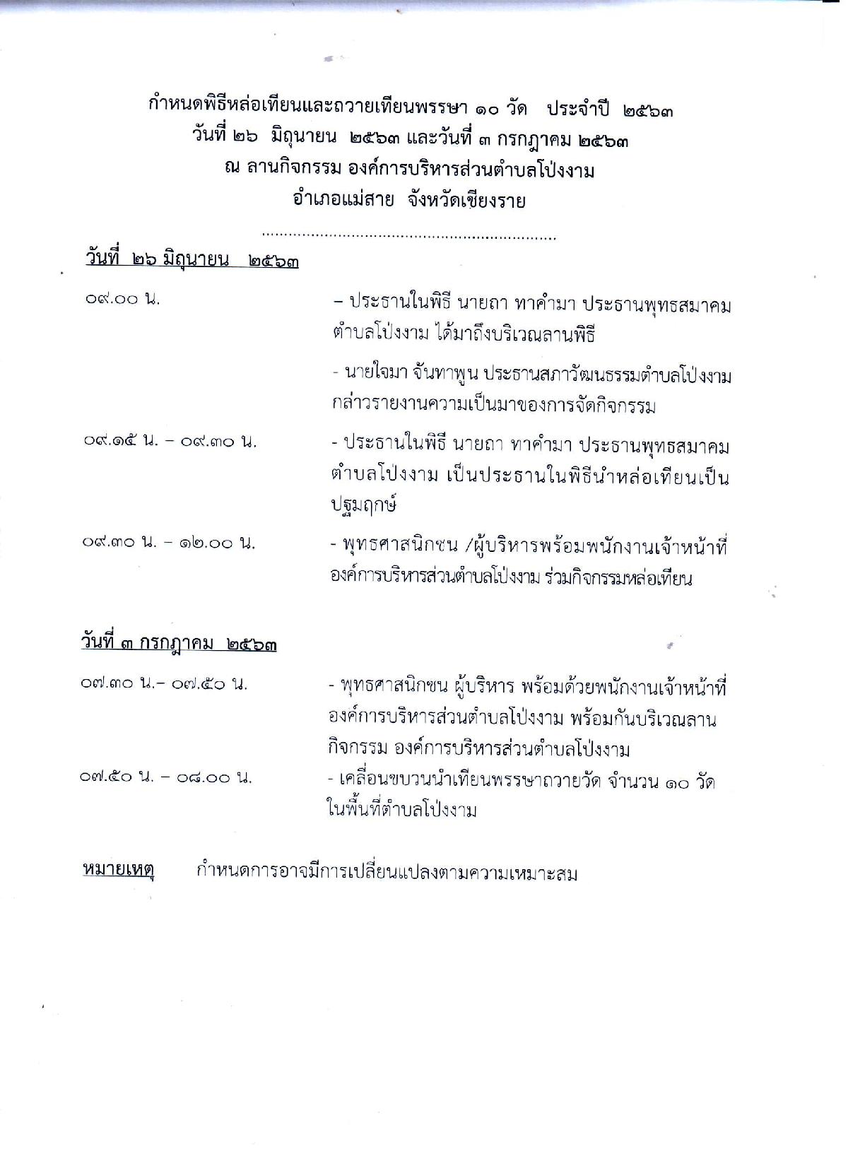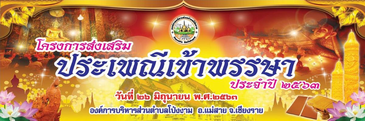 ด้วยทางองค์การบริหารส่วนตำบลโป่งงาม นำโดย นายแดนชัย บุลมาก นายกองค์การบริหารส่วนตำบลโป่งงาม ร่วมกับพุทธสมาคมตำบลโป่งงาม และสภาวัฒนธรรมตำบลโป่งงาม ได้กำหนดจัดกิจกรรมโครงการส่งเสริมประเพณีเข้าพรรษา ประจำปีงบประมาณ พ.ศ.2563 โดยมีวัตถุประสงค์เพื่อให้ประชาชนได้ตระหนักถึงความสำคัญของประเพณีและวัฒนธรรมท้องถิ่น อีกทั้งเป็นการอนุรักษ์และสืบสานประเพณีให้สืบทอดต่อไป ทางองค์การบริหารส่วนตำบลโป่งงาม จึงขอประชาสัมพันธ์ เชิญชวนพุทธศาสนิกชนเข้าร่วม โครงการส่งเสริมประเพณีเข้าพรรษา กิจกรรมหล่อเทียนพรรษา ในวันที่ 26 มิถุนายน 2563 ณ องค์การบริหารส่วนตำบลโป่งงาม อำเภอแม่สาย จังหวัดเชียงราย