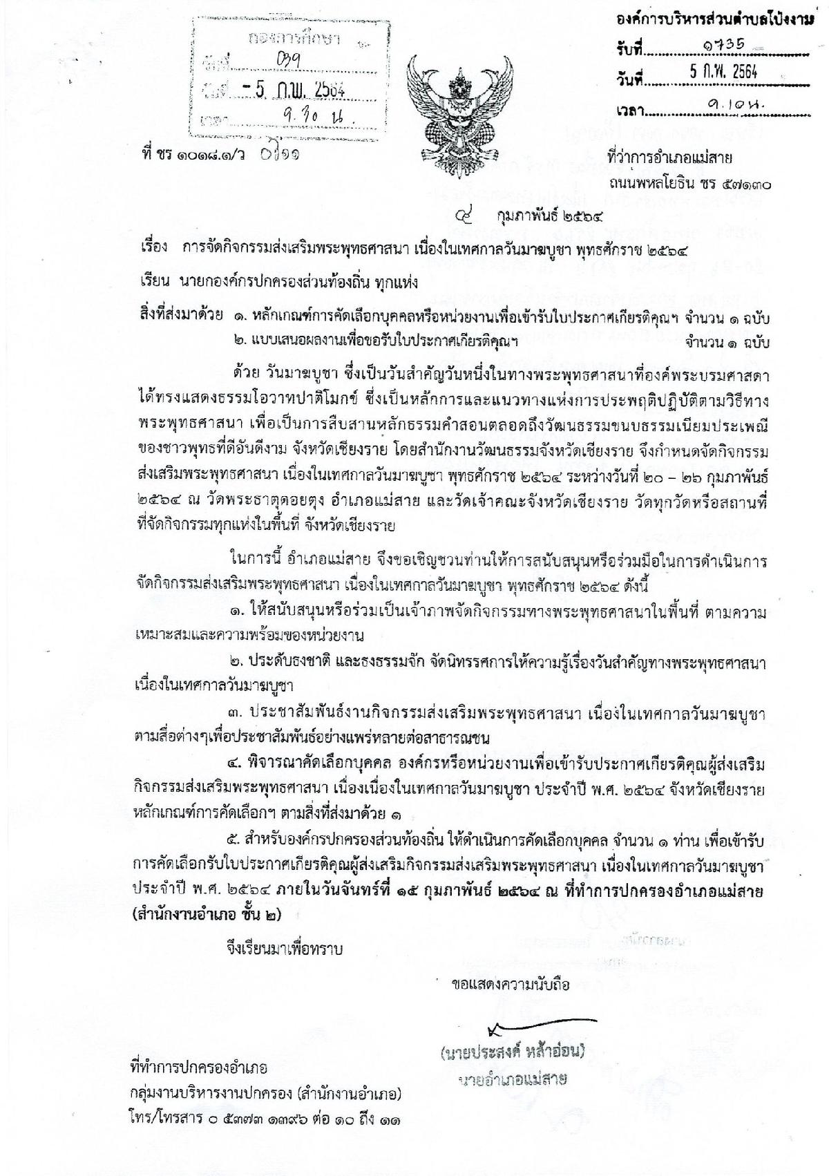 ประชาสัมพันธ์ การจัดกิจกรรมส่งเสริมพระพุทธศาสนา เนื่องในเทศกาลวันมาฆบูชา พุทธศักราช 2564 ระหว่างวันที่ 20-26 กุมภาพันธ์ 2564 ณ วัดพระธาตุดอยตุง อำเภอเเม่สาย จังหวัดเชียงราย