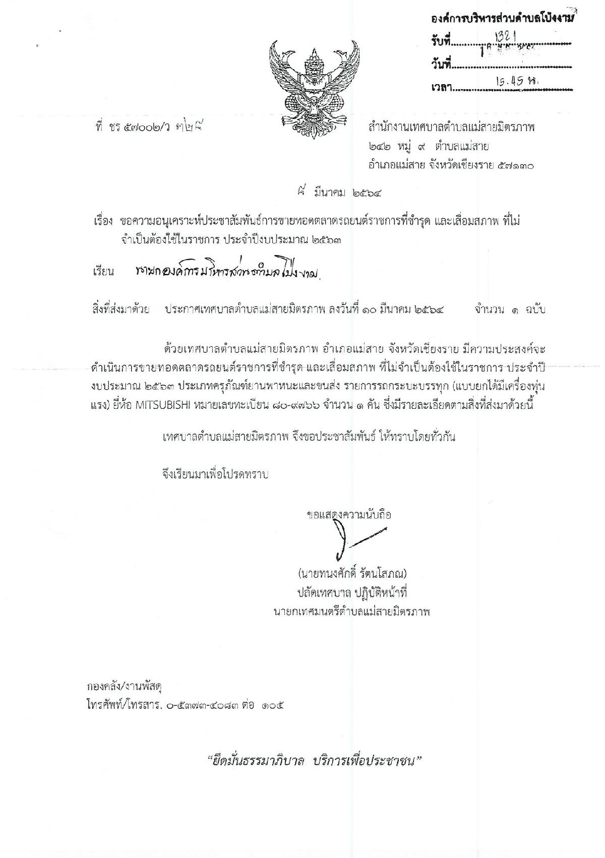 ประชาสัมพันธ์การขายทอดตลาดรถยนต์ราชการที่ชำรุด และเสื่อมสภาพ ที่ไม่จำเป็นต้องใช้ในราชการ ประจำปีงบประมาณ 2563 ประเภทครุภัณฑ์ยานพาหนะและขนส่ง