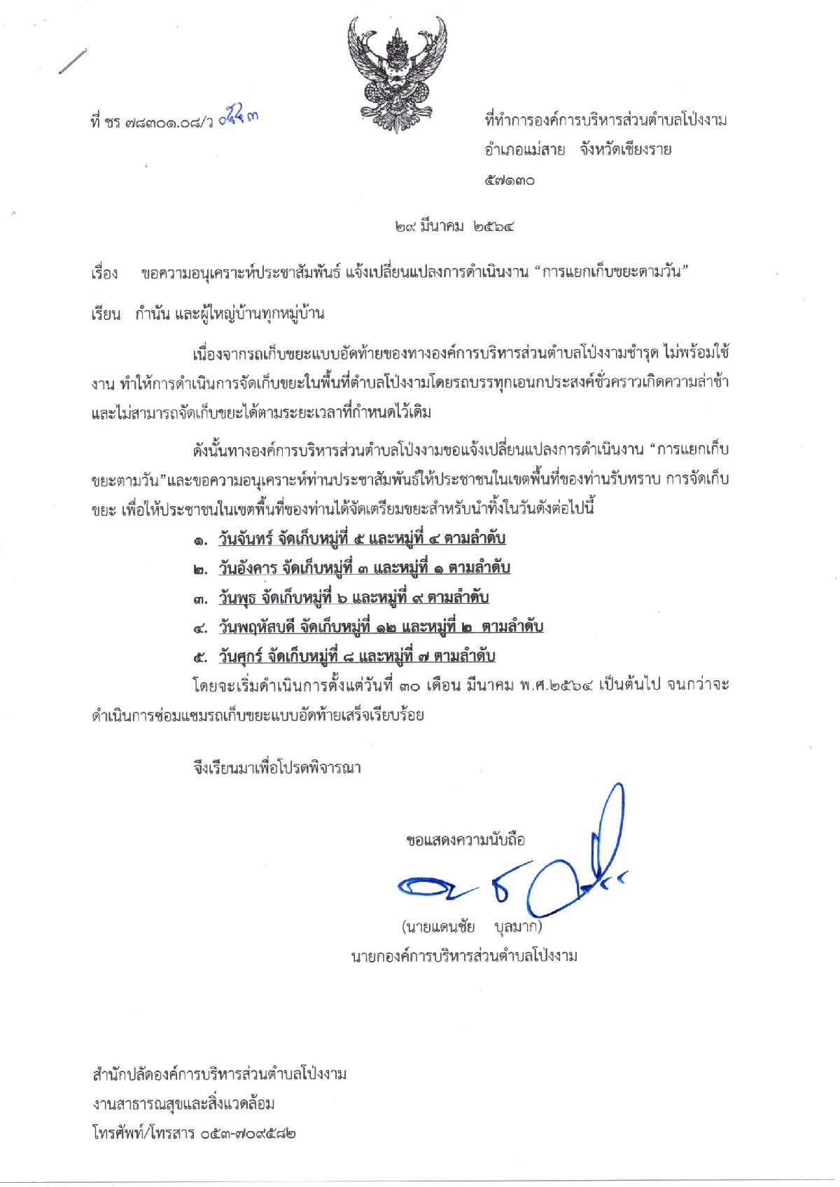 ดังนั้นทางองค์การบริหารส่วนตำบลโป่งงามขอแจ้งเปลี่ยนแปลงการดำเนินงาน “การแยกเก็บขยะตามวัน”ให้ประชาชนในเขตพื้นที่ได้จัดเตรียมขยะสำหรับนำทิ้งตามตารางดังแนบด้วย