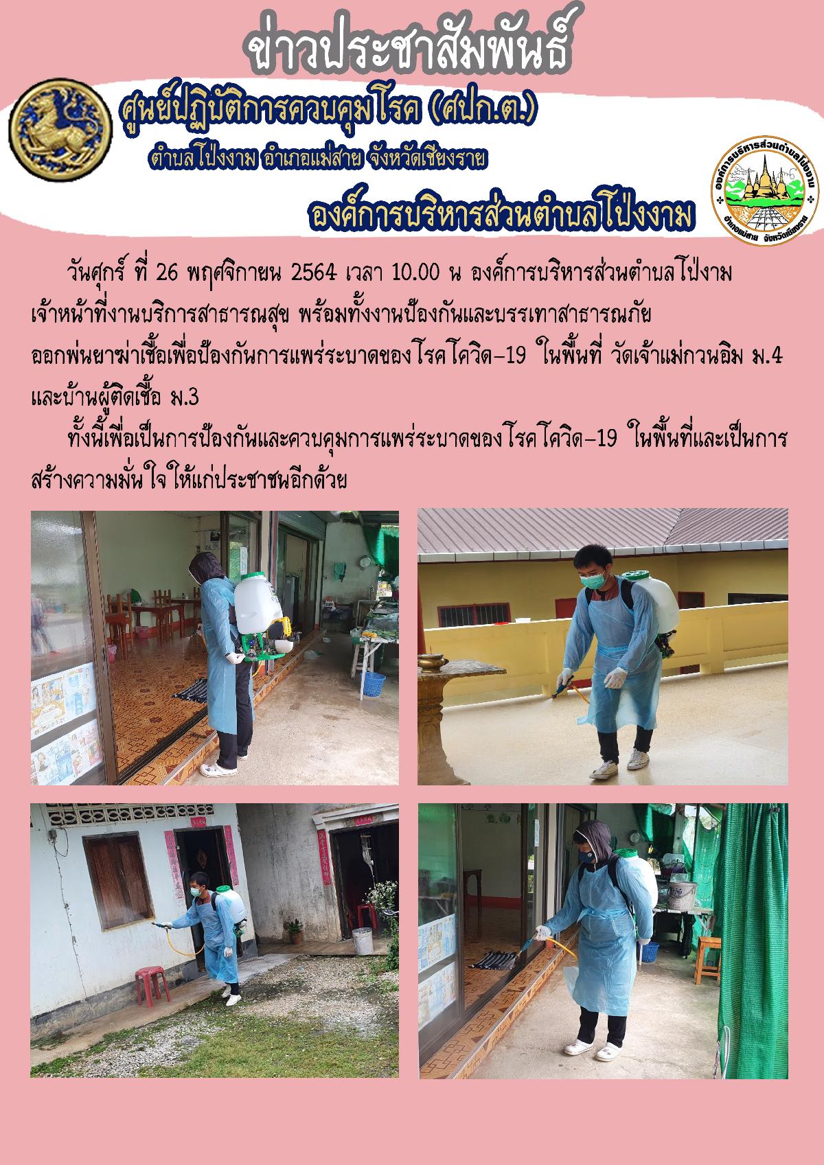 วันศุกร์ ที่ 26 พฤศจิกายน 2564 เวลา 10.00 น. เจ้าหน้าที่งานบริการสาธารณสุข พร้อมทั้งงานป้องกันและบรรเทาสาธารณภัย ออกพ่นยาฆ่าเชื้อเพื่อป้องกันการแพร่ระบาดของโรคโควิด-19 ในพื้นที่ วัดเจ้าแม่กวนอิม ม.4 เเละบ้านผู้ติดเชื้อ ม.3