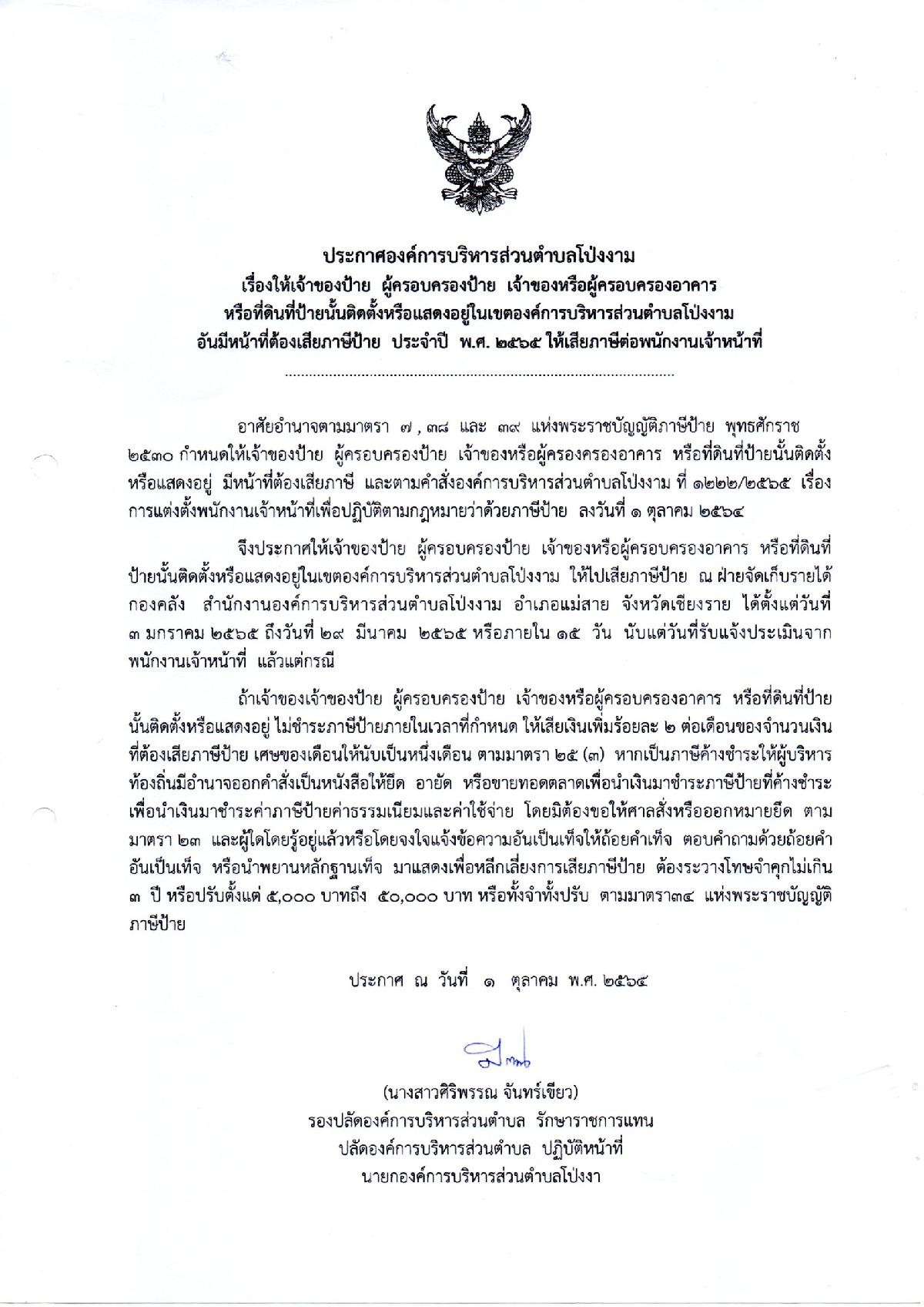 ประกาศองค์การบริหารส่วนตำบลโป่งงาม เรื่อง ให้เจ้าของป้าย ผู้ครอบครองป้าย เจ้าของหรือผู้ครอบครองอาคารหรือที่ดินที่ป้ายนั้นติดตั้งอันมีหน้าที่เสียภาษีป้าย ประจำปี พ.ศ. 2565 ให้เสียภาษีต่อพนักงานเจ้าหน้าที่