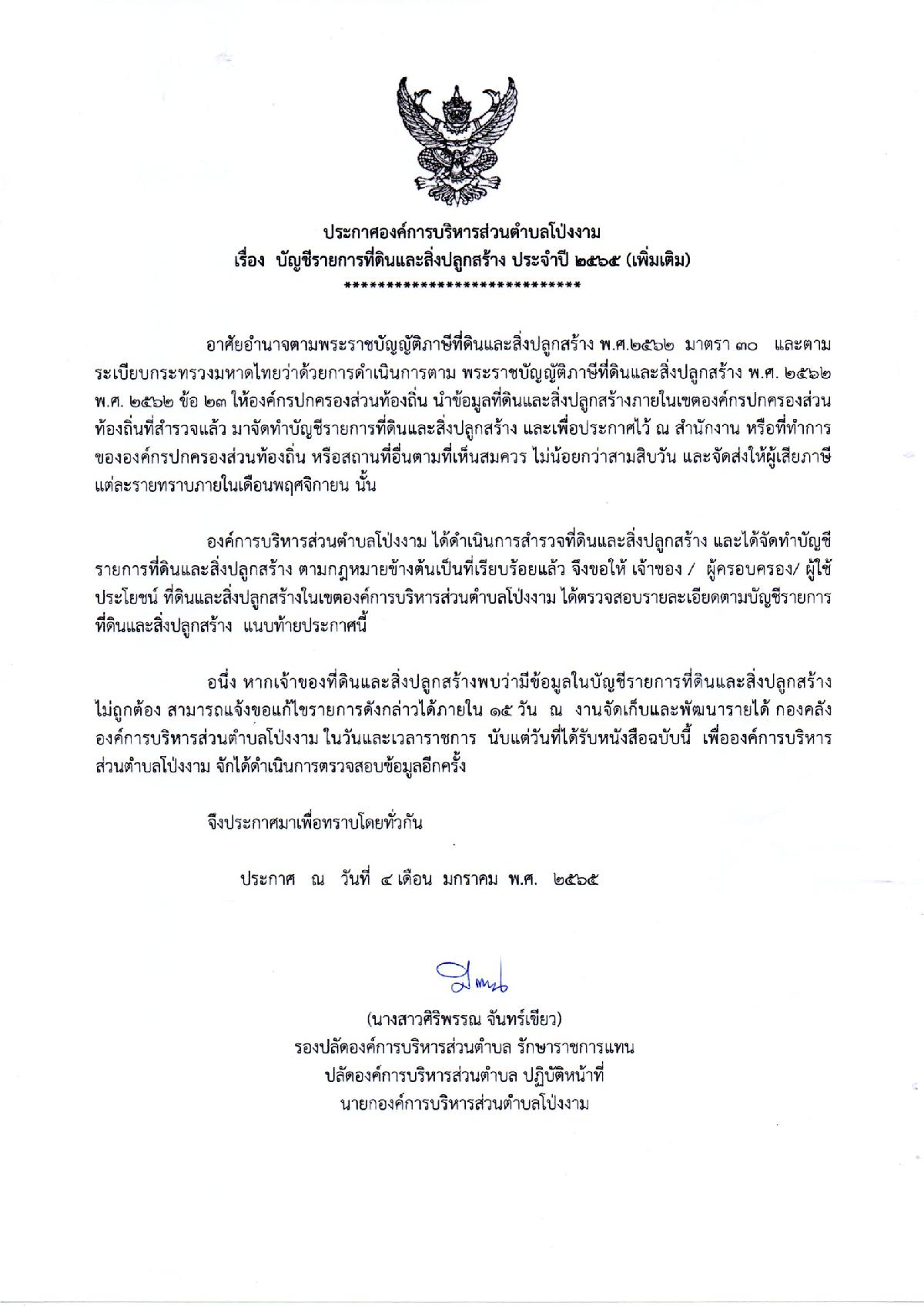 ประกาศองค์การบริหารส่วนตำบลโป่งงาม เรื่อง บัญชีรายการที่ดินและสิ่งปลูกสร้าง ประจำปี 2565 (เพิ่มเติม)