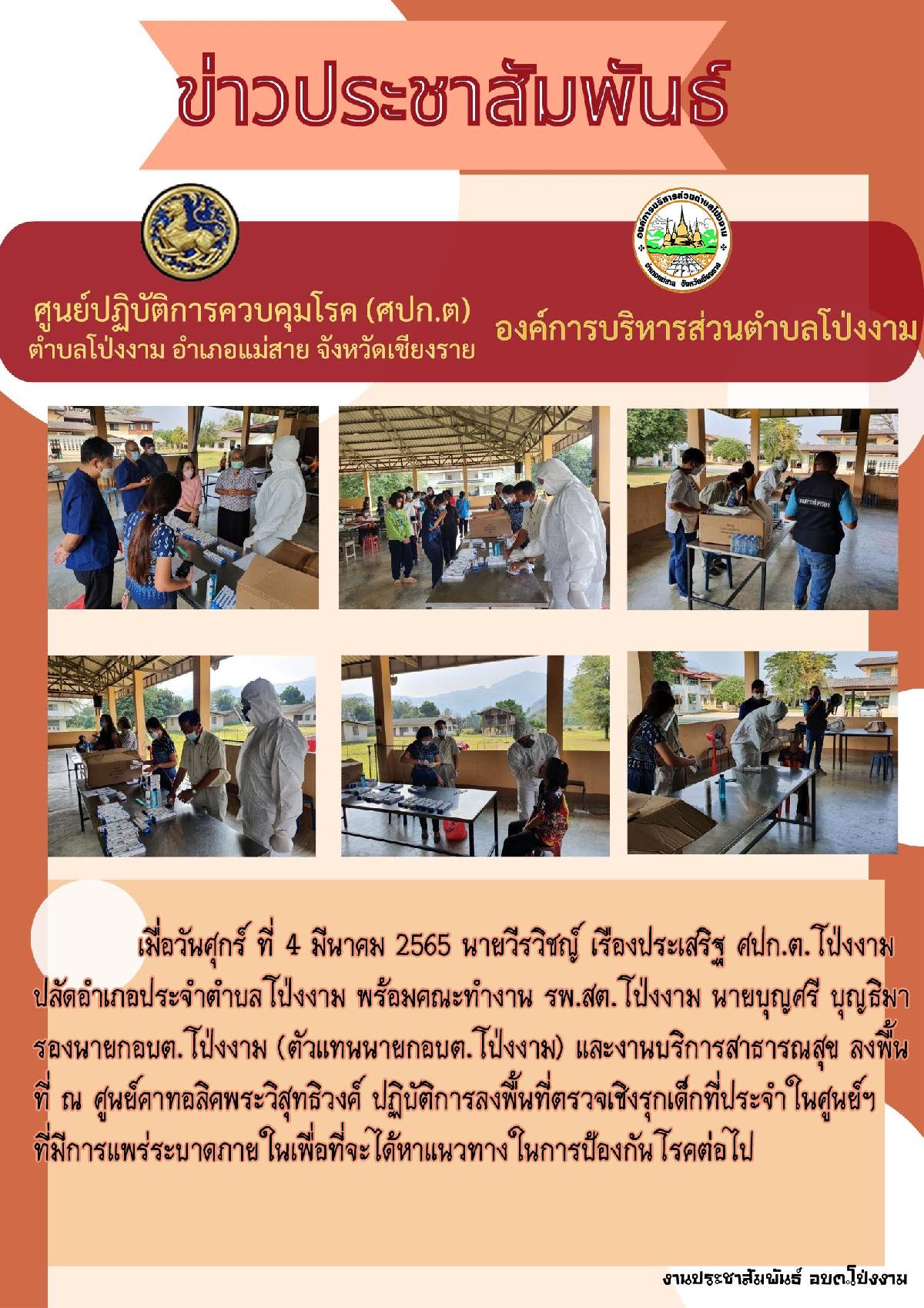 เมื่อวันศุกร์ ที่ 4 มีนาคม 2565 นายวีรวิชญ์ เรืองประเสริฐ ศปก.ต.โป่งงาม ปลัดอำเภอประจำตำบลโป่งงาม พร้อมคณะทำงาน รพ.สต.โป่งงาม นายบุญศรี บุญธิมา รองนายกอบต.โป่งงาม (ตัวแทนนายกอบต.โป่งงาม) และงานบริการสาธารณสุข ลงพื้นที่ ณ ศูนย์คาทอลิคพระวิสุทธิวงค์ ปฏิบัติการลงพื้นที่ตรวจเชิงรุกเด็กที่ประจำในศูนย์ฯ ที่มีการแพร่ระบาดภายในเพื่อที่จะได้หาแนวทางในการป้องกันโรคต่อไป