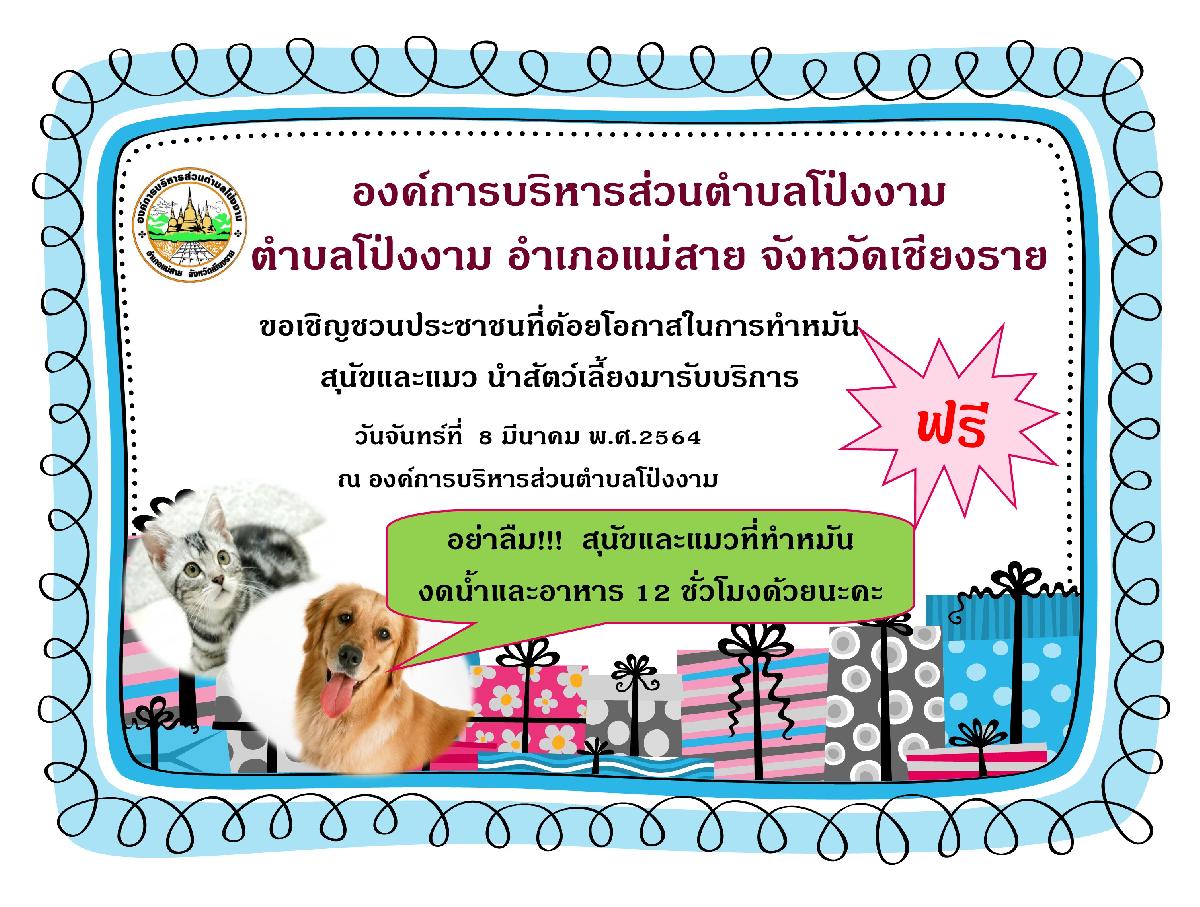 นายแดนชัย บุลมาก นายกองค์การบริหารส่วนตำบลโป่งงาม ได้ให้ความสำคัญกับเจ้าของสุนัขและแมวที่ด้อยโอกาสในการจัดการทำหมันให้สุนัขและแมวที่มีค่าใช้จ่ายค่อนข้างสูง จึงได้มอบหมายให้ งานสาธารณสุขและสิ่งแวดล้อม องค์การบริหารส่วนตำบลโป่งงามจัดกิจกรรมการให้บริการทำหมันสุนัขและแมวฟรี โดยจะทำการจัดกิจกรรมในวันจันทร์ที่ 8 มีนาคม พ.ศ.2564 ณ องค์การบริหารส่วนตำบลโป่งงาม ทั้งนี้ผู้สนใจเข้าร่วมกิจกรรมที่จะนำสุนัขและแมวเข้ามารับบริการ ขอให้งดการให้น้ำให้อาหารเป็นเวลา 12 ชั่วโมง