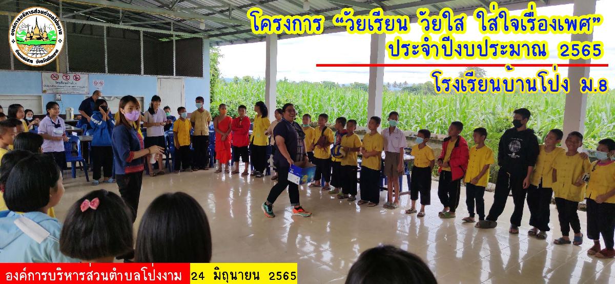 งานพัฒนาชุมชน อบต.โป่งงาม จัดโดยศูนย์พัฒนาครอบครัวในชุมชน ต.โป่งงาม สนับสนุนโดยกองทุนหลักประกันสุขภาพ อบต.โป่งงาม ได้จัดโครงการ"วัยเรียน วัยใส ใส่ใจเรื่องเพศ" ประจำปีงบประมาณ พ.ศ. 2565 ณ โรงเรียนบ้านโป่ง หมู่ 8 ต.โป่งงาม