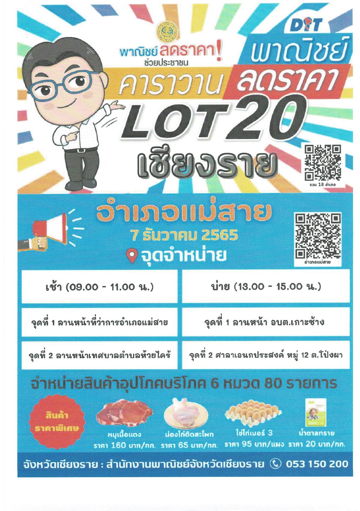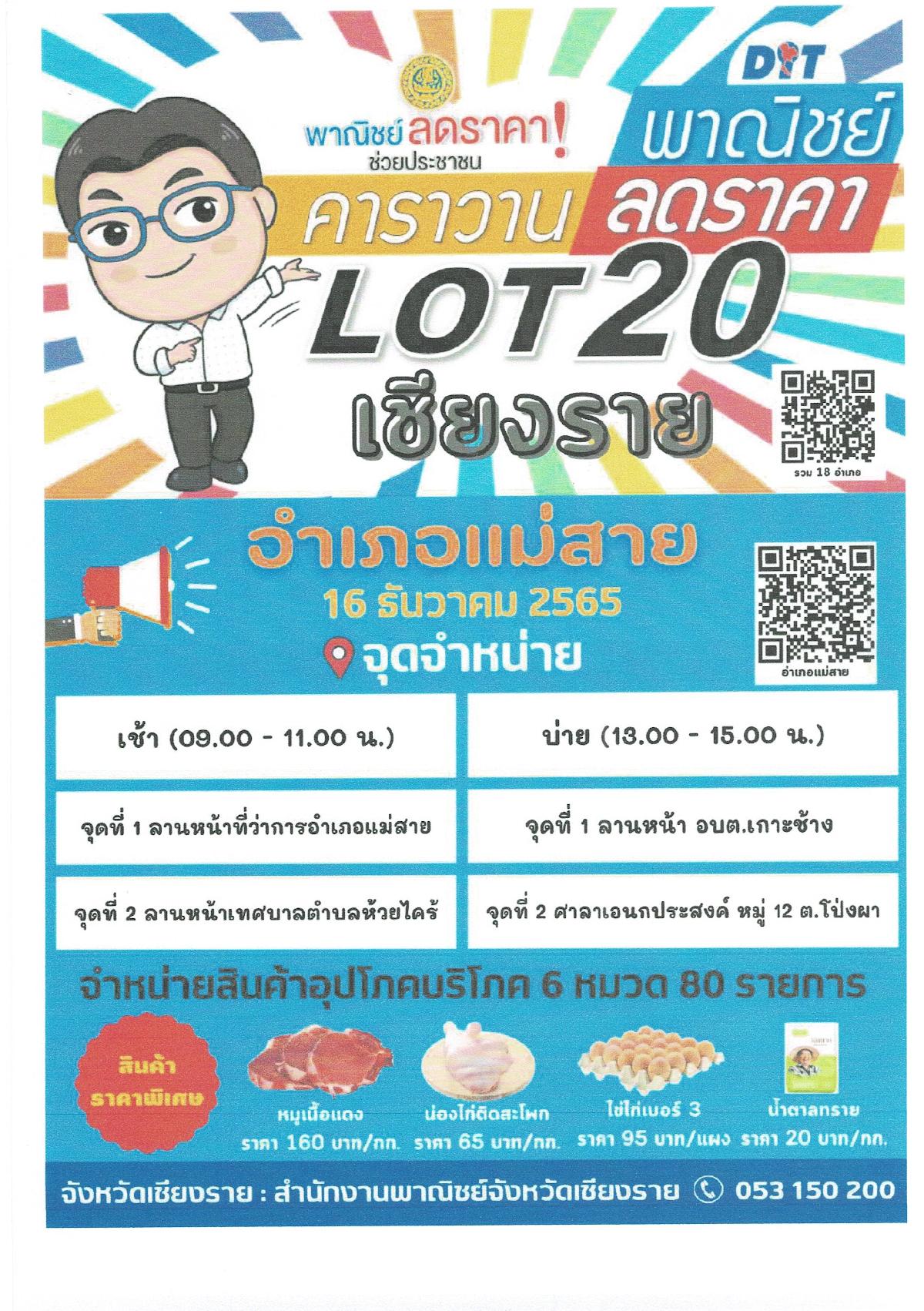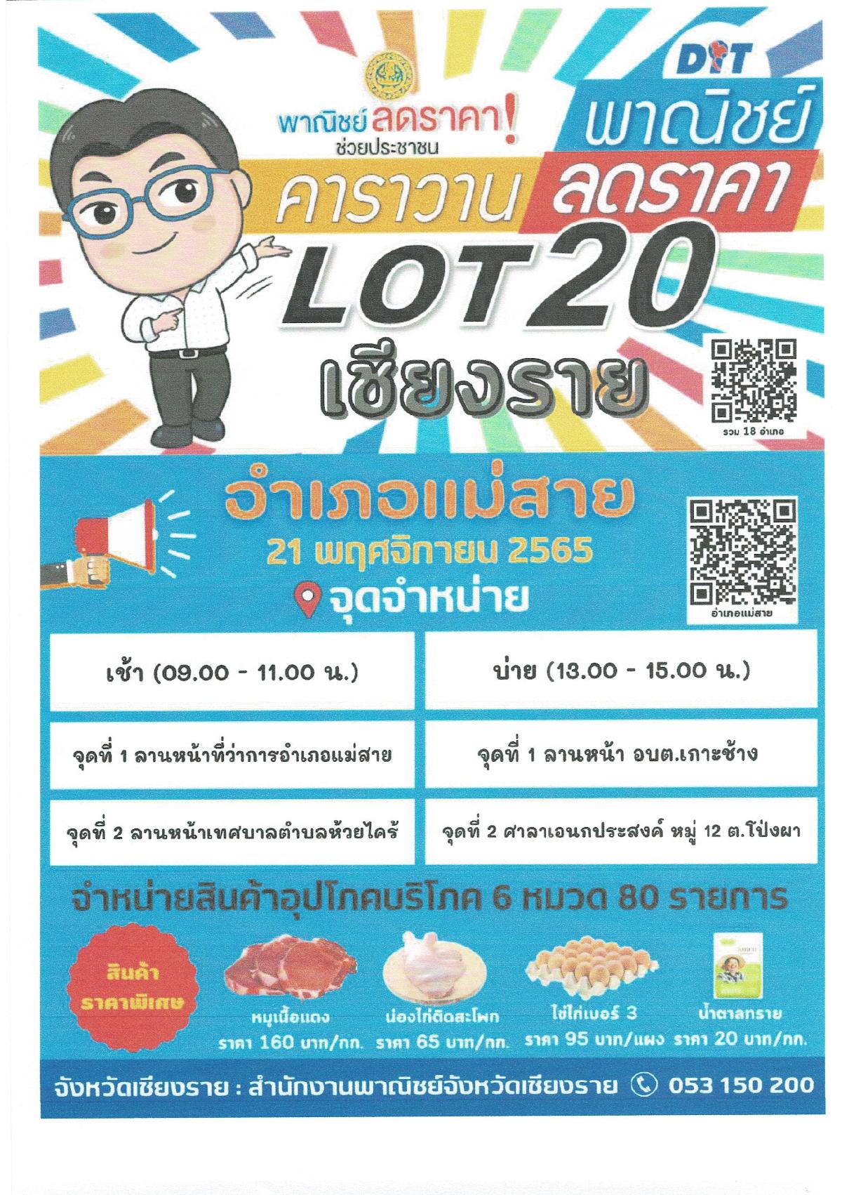 ประชาสัมพันธ์ โครงการพาณิชย์ .... ลดราคา! ช่วยประชาชน ปี 2565 (งวดที่ 3 ) ภายใต้ชื่อ "พาณิชย์...ลดราคา! Mobile ทั่วไทย Lot 20 ภูมิภาค" จังหวัดเชียงราย วันและเวลา จุดจำหน่าย ตามเอกสารแนบค่ะ