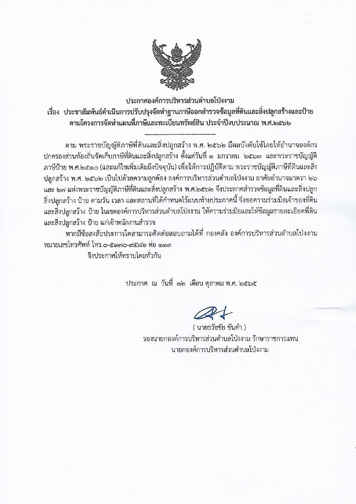 เรื่อง การออกสำรวจข้อมูลที่ดินและสิ่งปลูกสร้างและป้าย ประจำปีงบประมาณ 2566 กำหนดระยะเวลาที่จะเข้าทำการสำรวจที่ดินและสิ่งปลูกสร้างและป้ายในเขต อบต.โป่งงาม หมู่ที่ 1 - หมู่ที่ 12 ตั้งแต่แต่วันที่ 10 ตุลาคม 2565 เป็นต้นไป ระหว่างเวลา 08.30 -16.30 น.