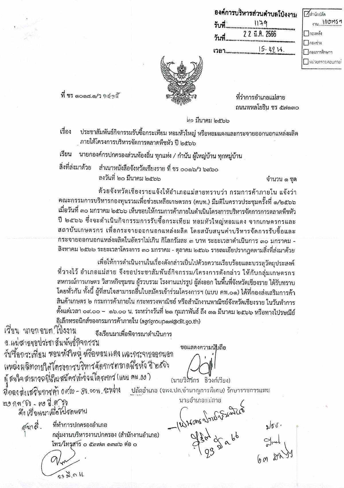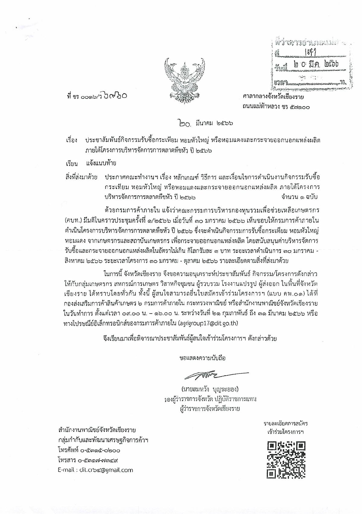 ????ประชาสัมพันธ์ กิจกรรมรับซื้อกระเทียม หอมหัวใหญ่ หรือหอมแดง และกระจายออกนอกแหล่งผลิต ภายใต้โครงการบริหารจัดการตลาดพืชหัว ปี 2566 โดยสนับสนุนค่าบริหารจัดการรับซื้อและกระจายออกนอกแหล่งผลิตในอัตราไม่เกิน กิโลกรัมละ 3 บาท
