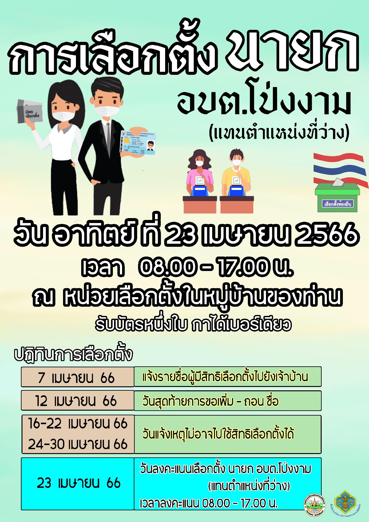 องค์การบริหารส่วนตำบลโป่งงาม ขอเชิญชวนให้ผู้มีสิทธิเลือกตั้งออกมาใช้สิทธิเลือกตั้ง นายก อบต.โป่งงงาม (ตำแหน่งที่ว่าง)